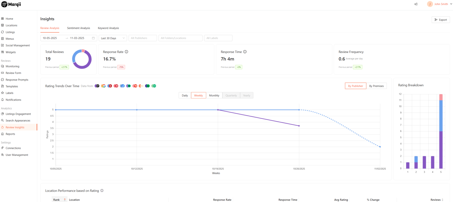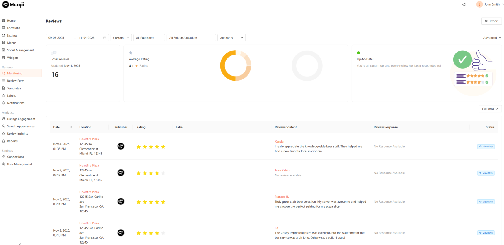 The First Party Reviews can be accessed on the Marqii Dashboard through the Review Monitoring Tab.
