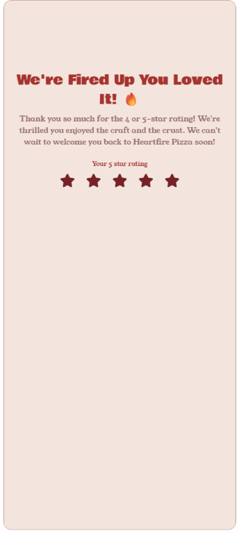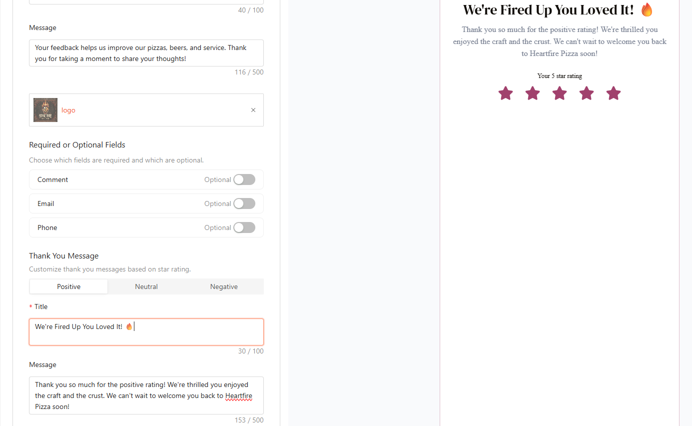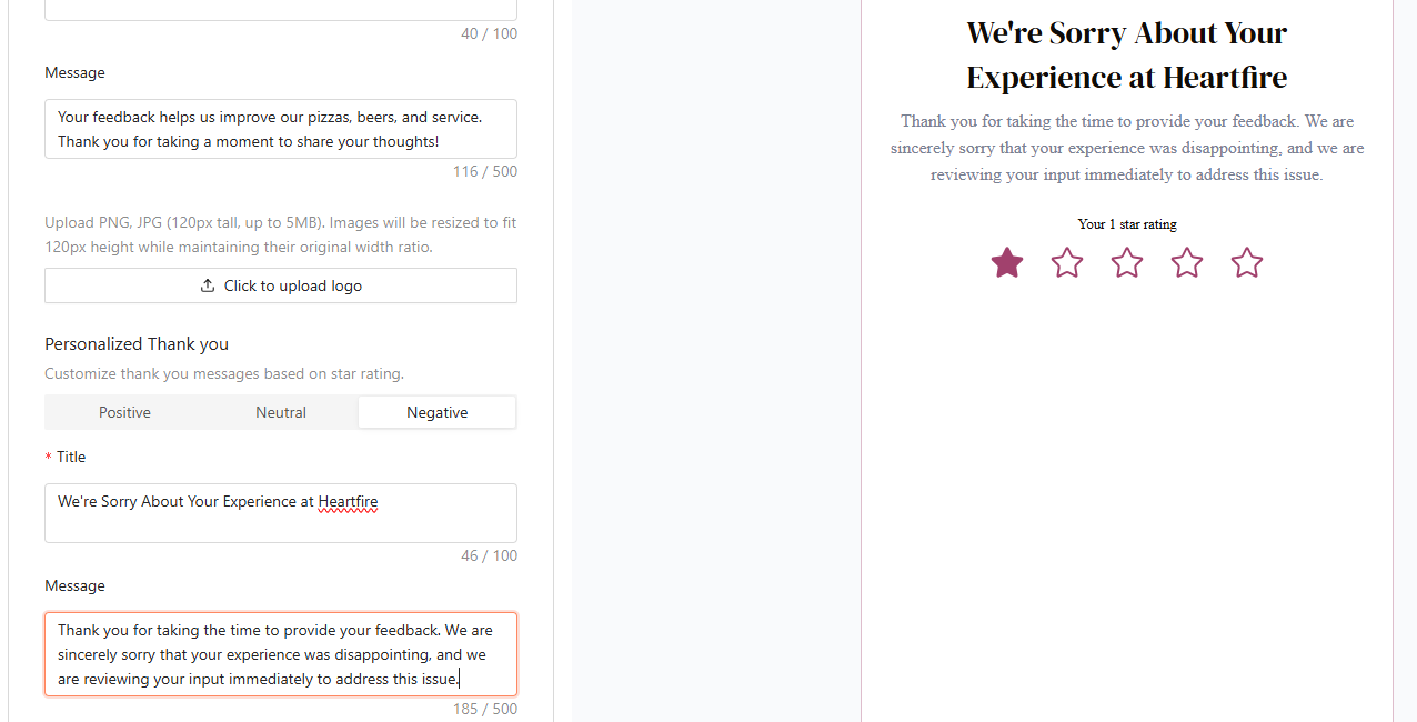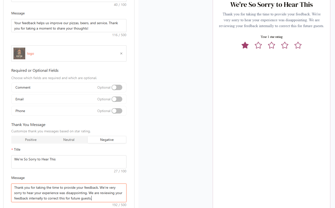 - Message - A customized message that appears after a customer submits a review, based on the star rating they provided. It thanks the customer for their feedback, and you can tailor separate messages for positive, neutral, and negative responses to match the sentiment. There is a 500 maximum character limit.