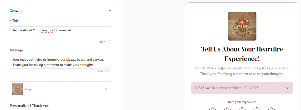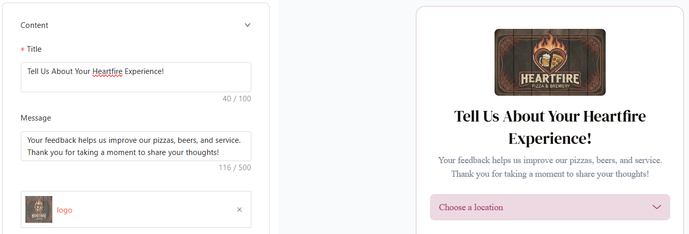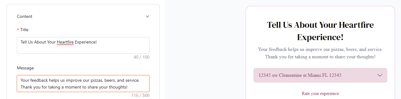 - Message - This is a customizable note that appears below the title. Its purpose is to welcome customers, provide context, and encourage honest feedback. By explaining why their input matters, it helps make the experience feel personal. The message is not a required field, but strongly encouraged. There is a 500 maximum character limit.