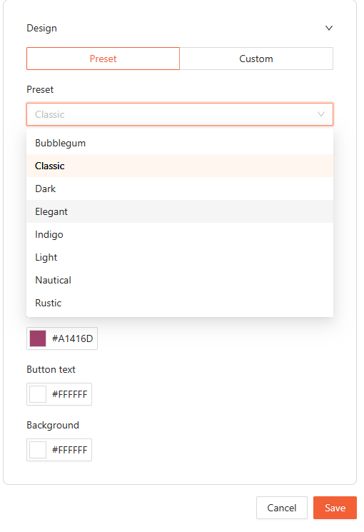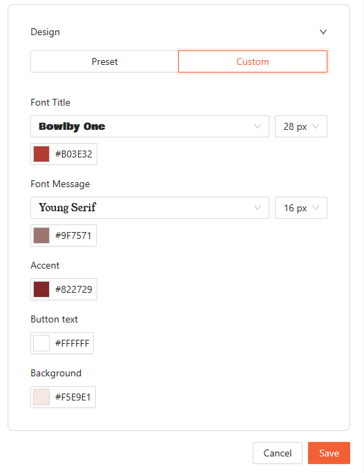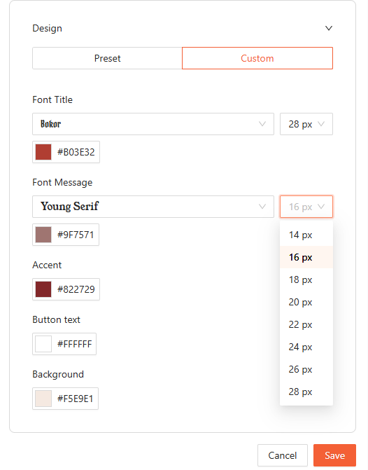 Note: Once you make changes to the font size, color, or any other design setting, the preset will automatically switch to the “Custom” tab. Any preset styles you haven’t modified will still remain applied.