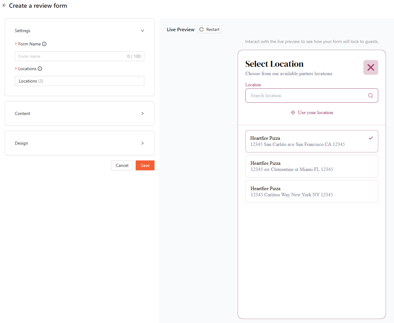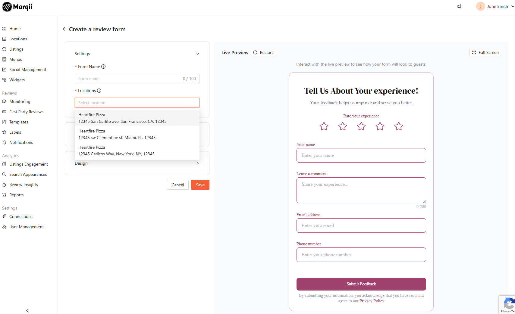 When a customer fills out the review form and multiple locations are assigned, a drop-down menu will appear for them to select the location they visited.
