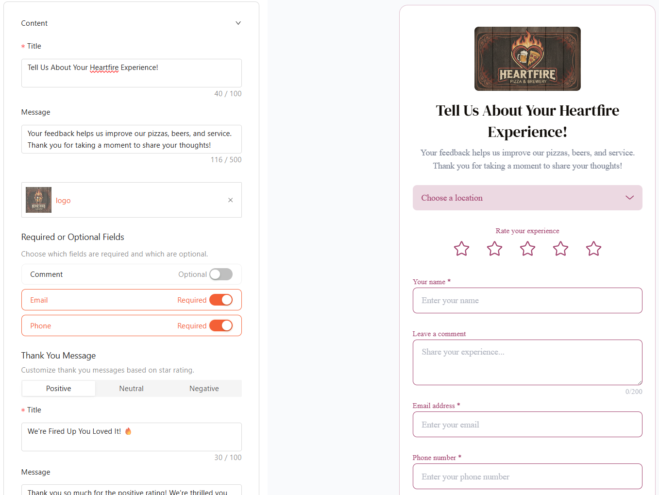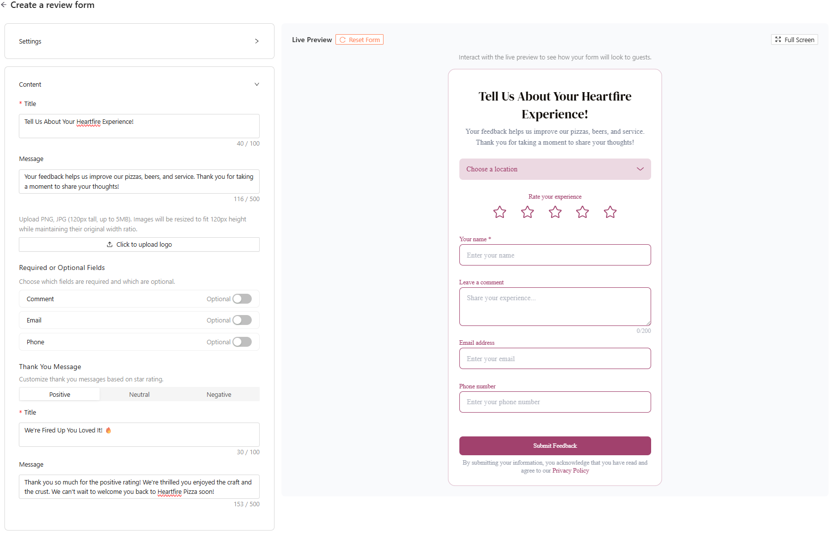 You are able to set whether the Comment, Email, or Phone Number fields are optional or required for the guest to fill out to submit their review.