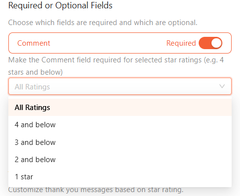 The comment field can be set to be required based on the review rating. You have the option to set it as required for all ratings, 4 stars and below, 3 stars and below, 2 stars and below, or 1 star ratings only.