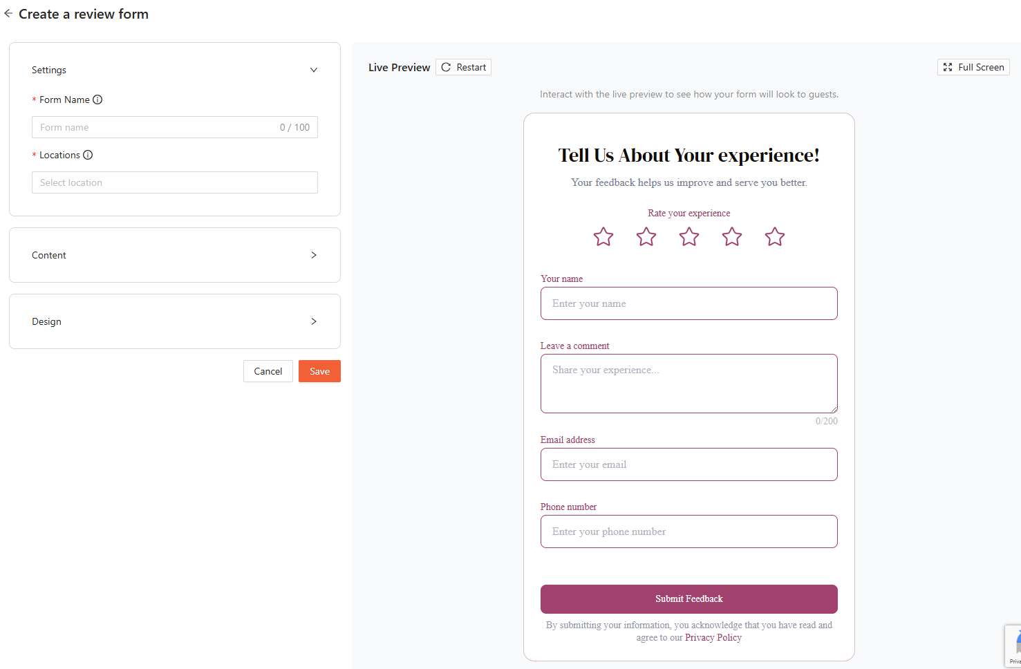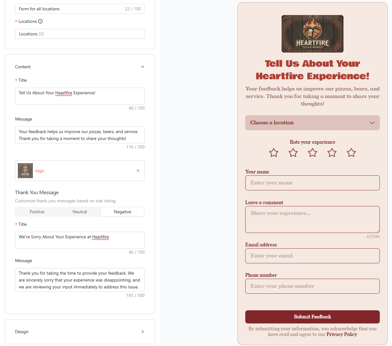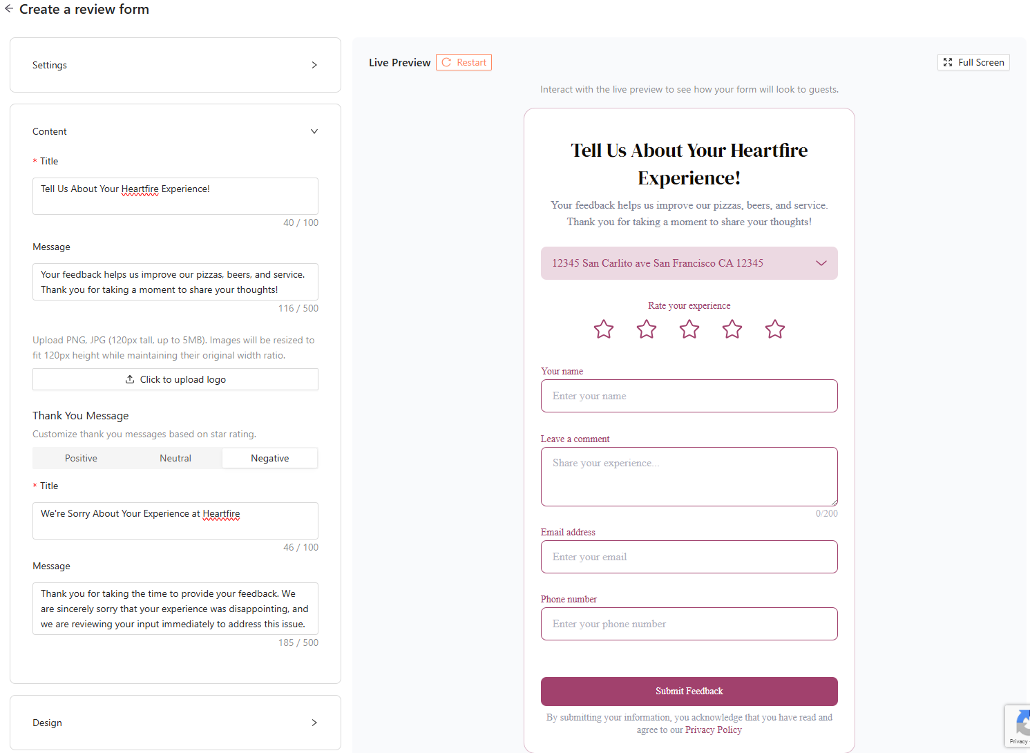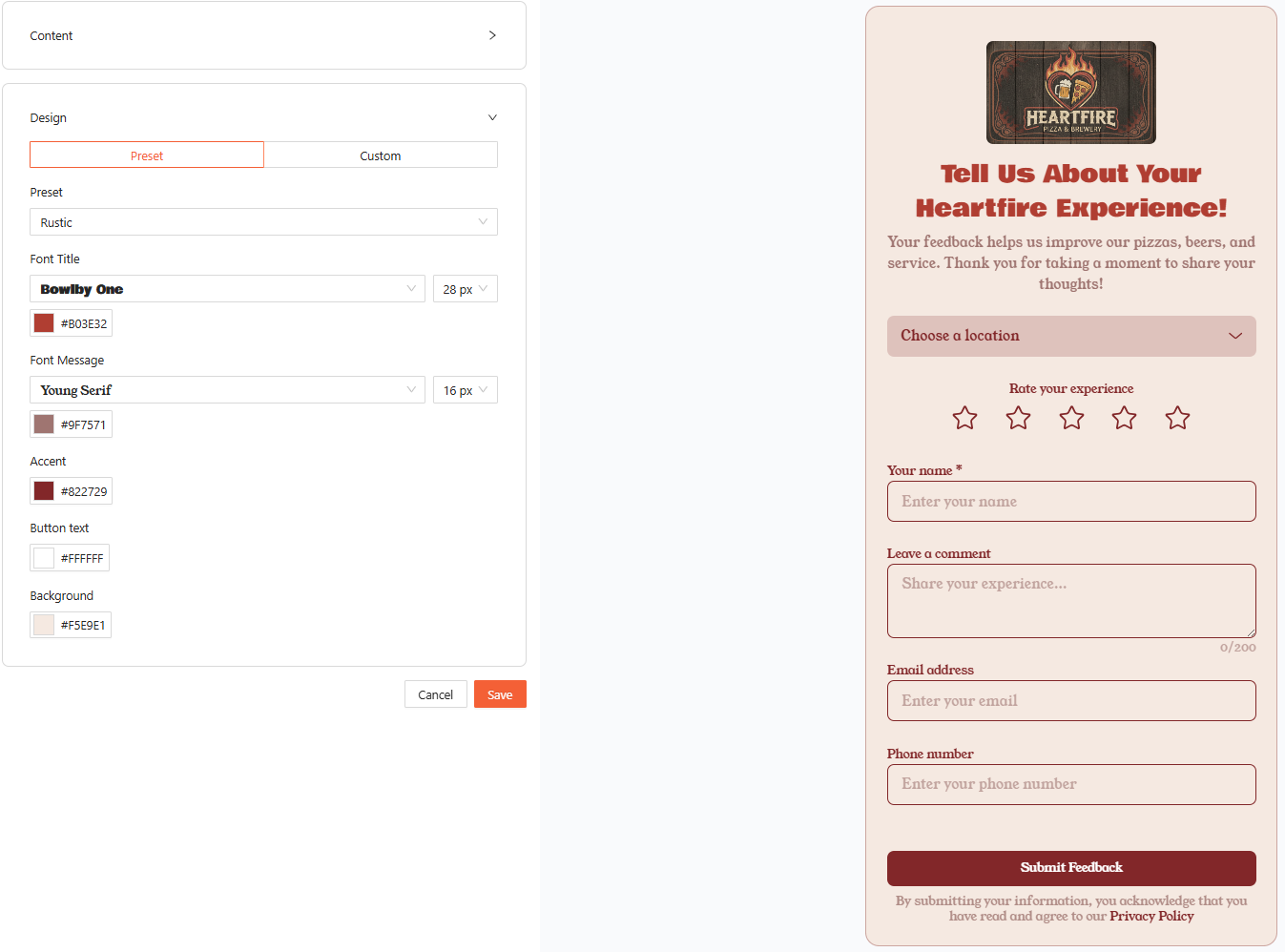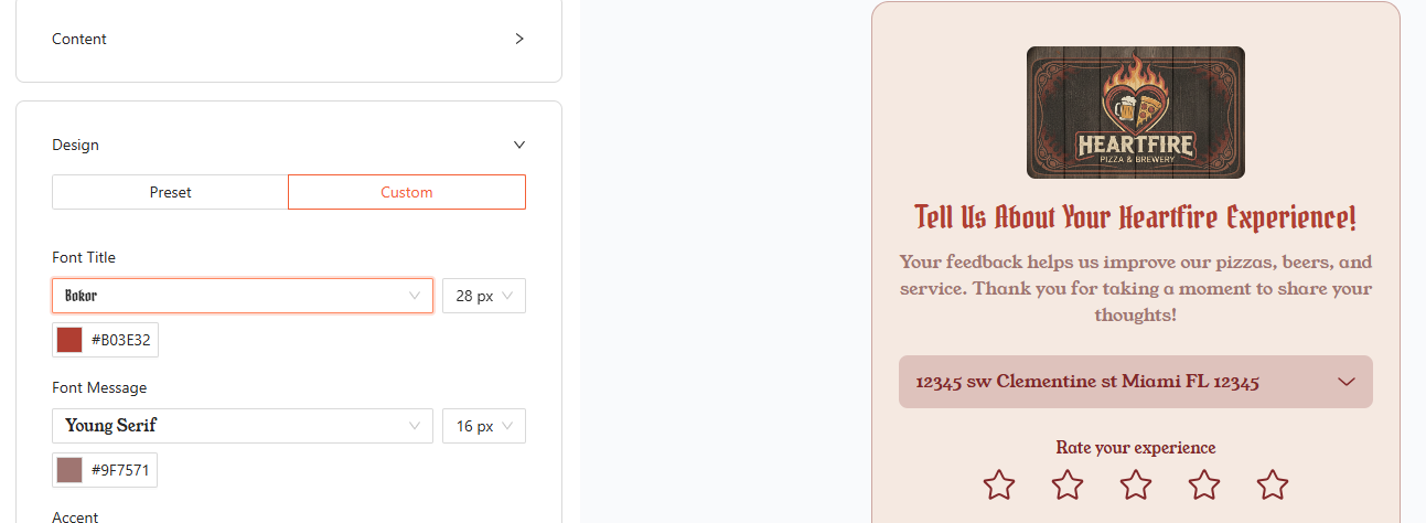 Under "Design" on the review form creation, you can customize colors, highlights, fonts, and backgrounds to match your brand. Choose from ready made presets or create a fully custom design from scratch.