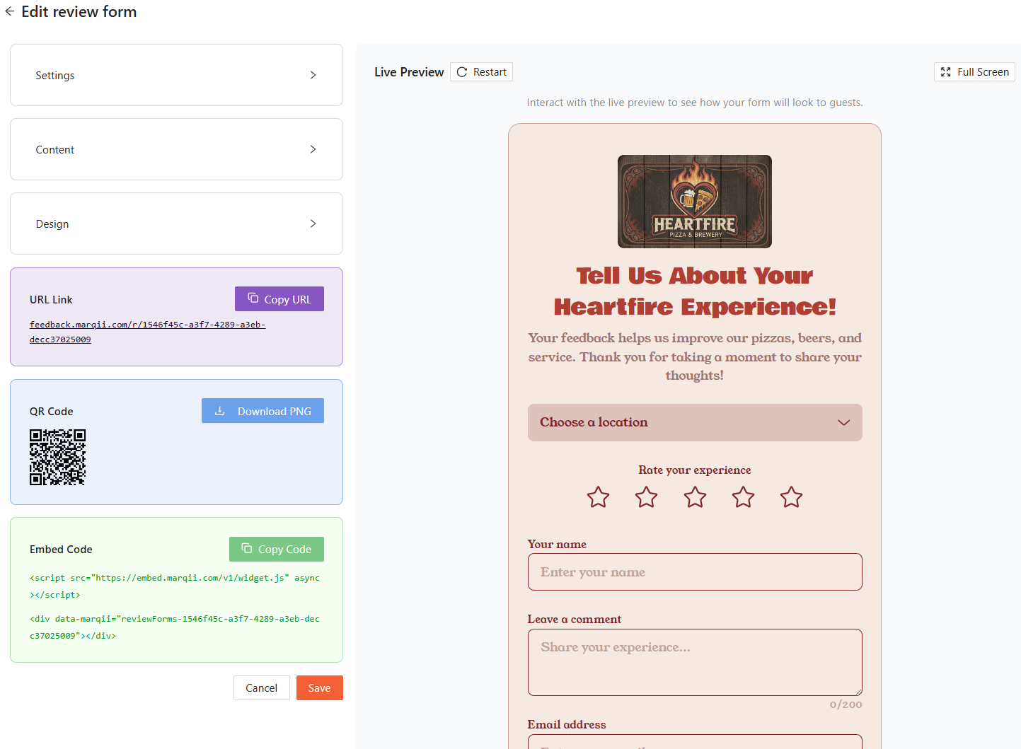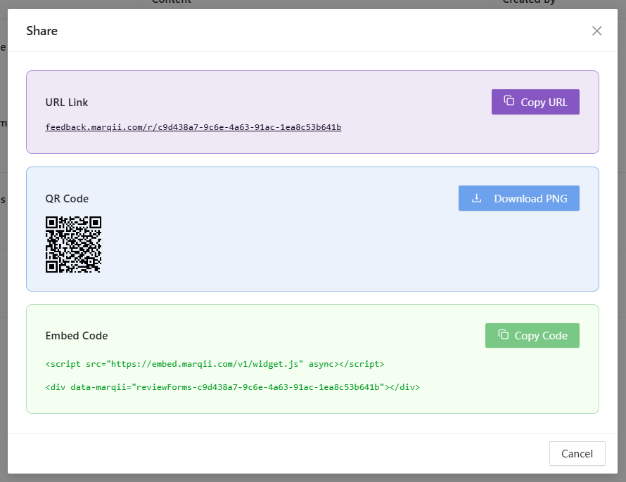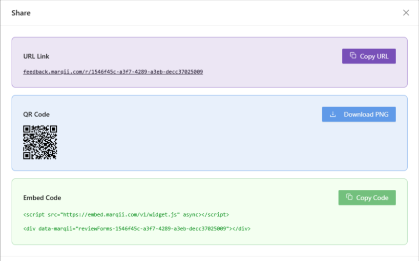 You can create a Marqii First-Party Review form directly from the dashboard. It’s available in three formats: website link, QR code, or embed code.