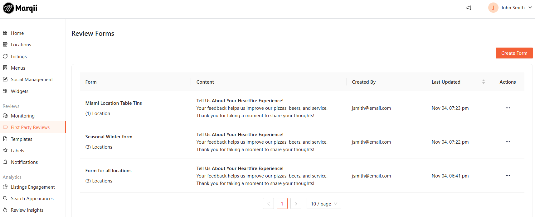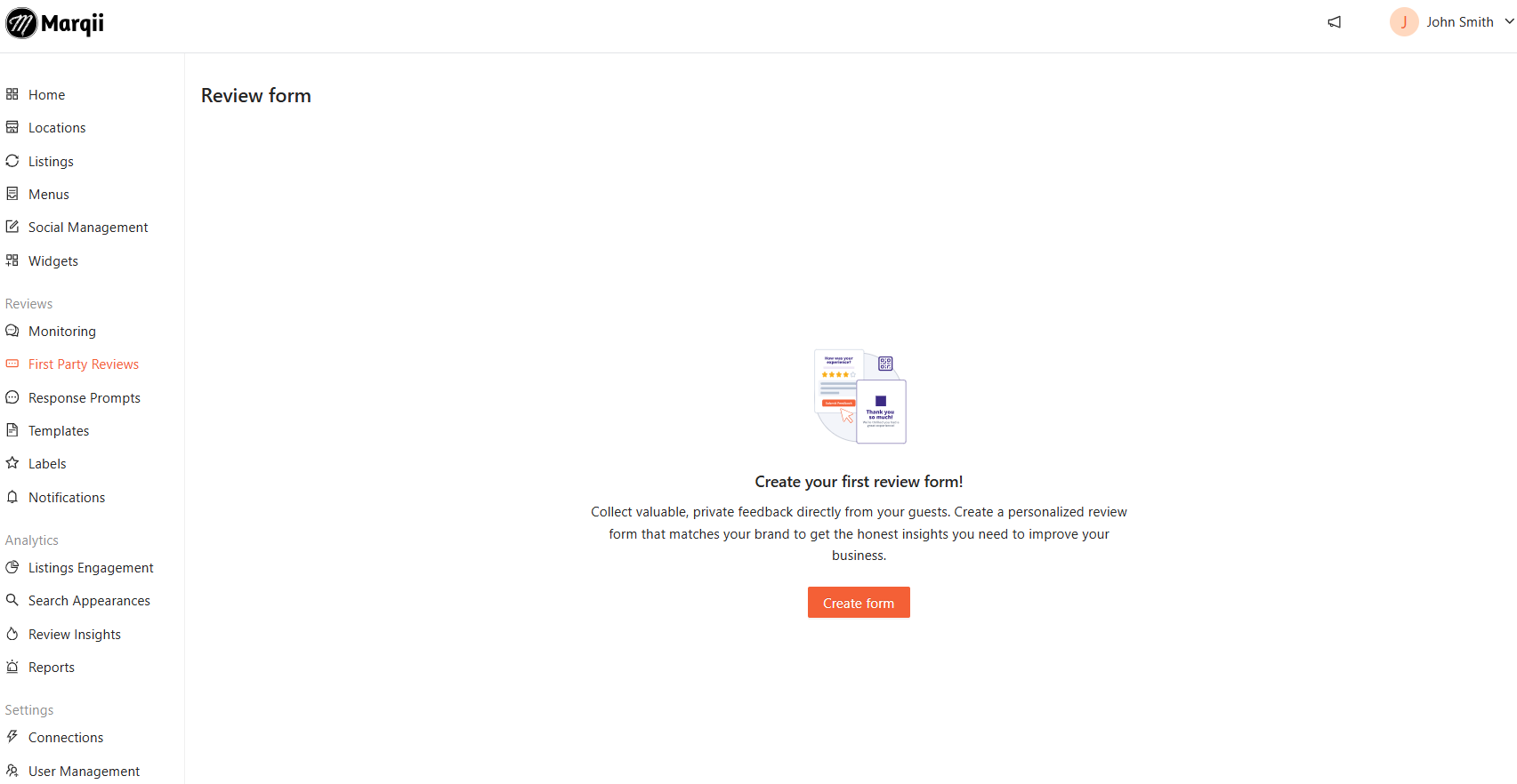 - Under the reviews section on the Marqii Dashboard, there is a tab called "First Party Reviews" Once "Review Form" is highlighted, you will see an orange button in the middle of the panel called "Create Form."