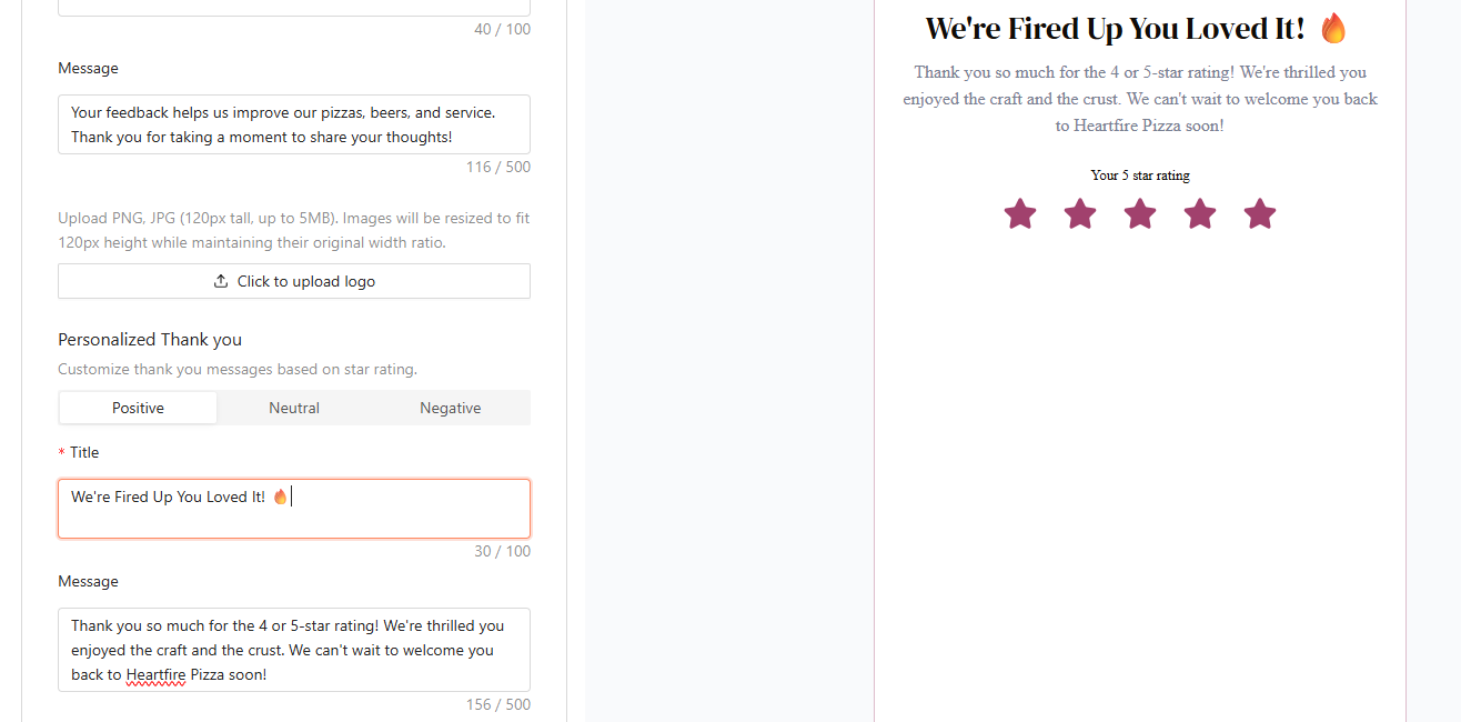 - Click on each sentiment (Positive, Neutral, Negative) to add specific titles and messages for that sentiment.