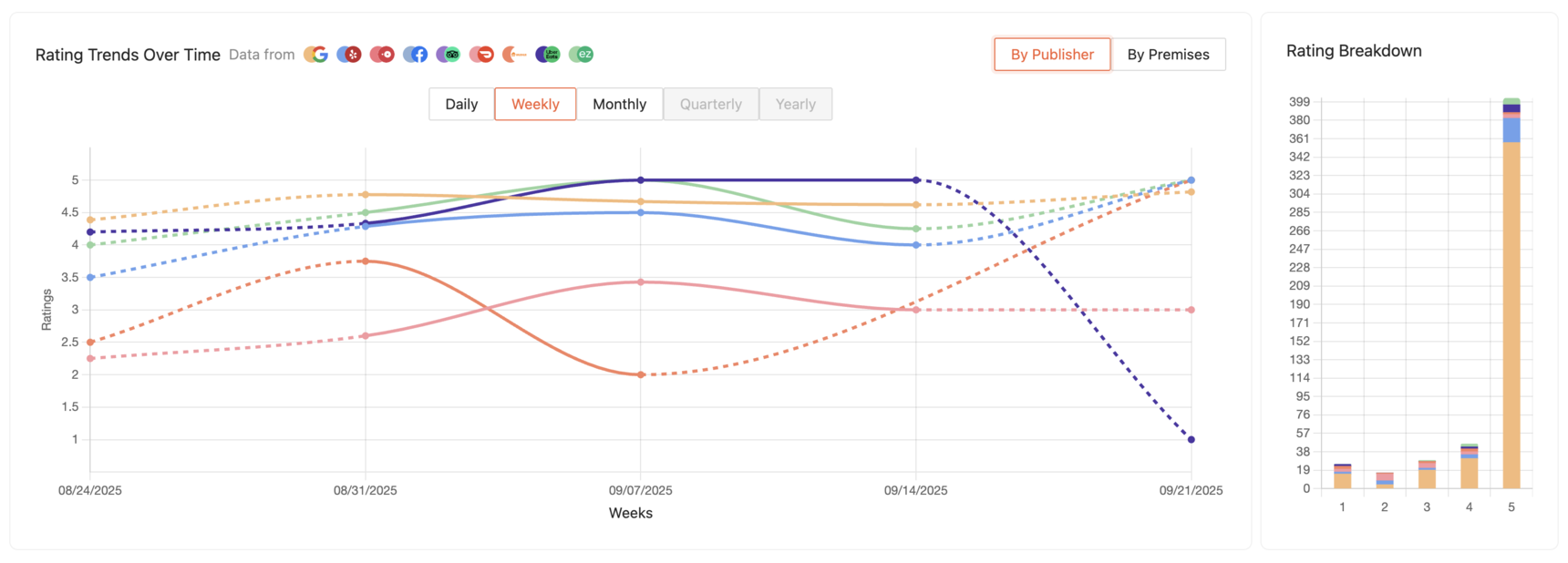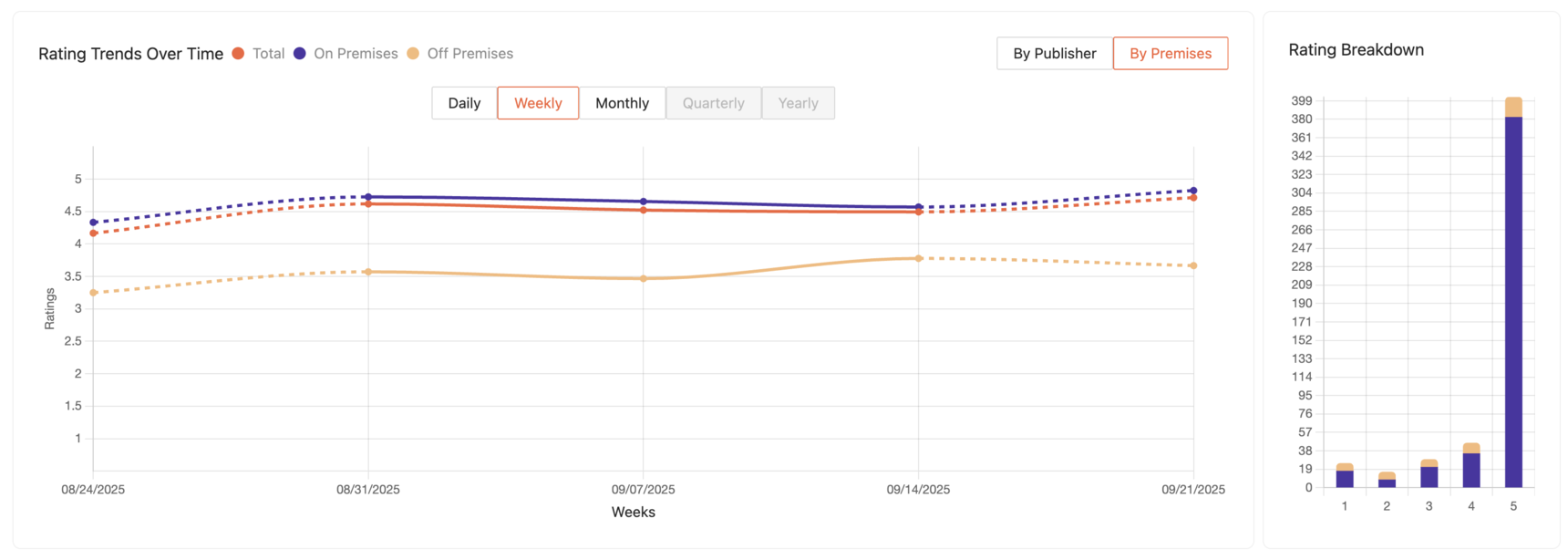 The Rating Trends Over Time graph visually tracks how your review ratings change over a selected period, across publishers as well as on-premises and off-premises feedback. By highlighting patterns and shifts in customer satisfaction, this tool helps you spot emerging issues, measure the impact of operational changes, and take proactive steps to improve your ratings.