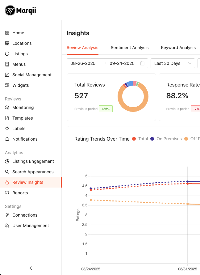 The Review Insights – Review Analysis page provides a detailed view of your ratings, response rate, response time, and review frequency. Review data is available at both the location level and the publisher level, allowing you to compare performance, identify rating trends, and uncover opportunities for improvement. This analysis gives you a clear picture of customer perception and helps guide actions to strengthen overall satisfaction.