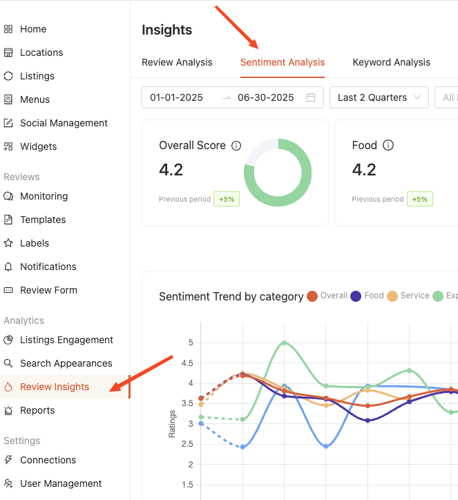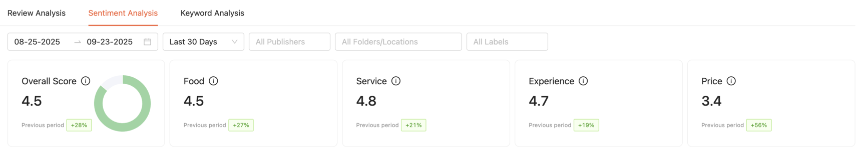 The Sentiment Analysis section brings together overall scores, category trends, and location-level performance in one place, giving you a clear and actionable view of customer perception. By filtering data by date range, publisher, location, or label, you can focus on the insights that matter most. Whether you’re tracking sentiment shifts over time, comparing on-premises vs. off-premises experiences, or identifying strengths and opportunities at the location level, these insights empower you to respond effectively and make data-driven decisions that strengthen the guest experience.