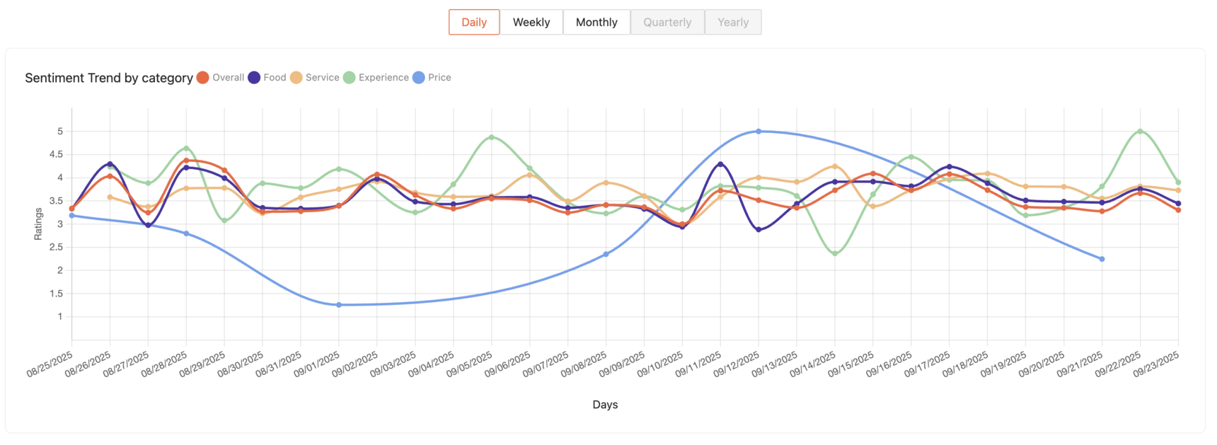 The Sentiment Trend by Category graph shows how customer sentiment changes over time for overall scores and specific categories like food, service, experience, and price. You can toggle between daily, weekly, monthly, quarterly, or yearly views to see both short-term fluctuations and long-term patterns. This view helps you compare categories side by side and quickly identify trends that highlight strengths and areas for improvement across your locations.
