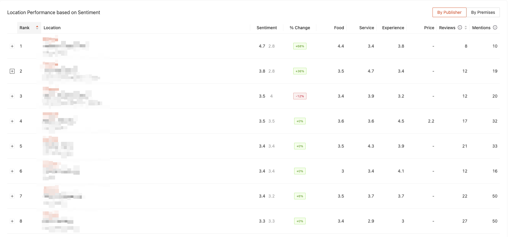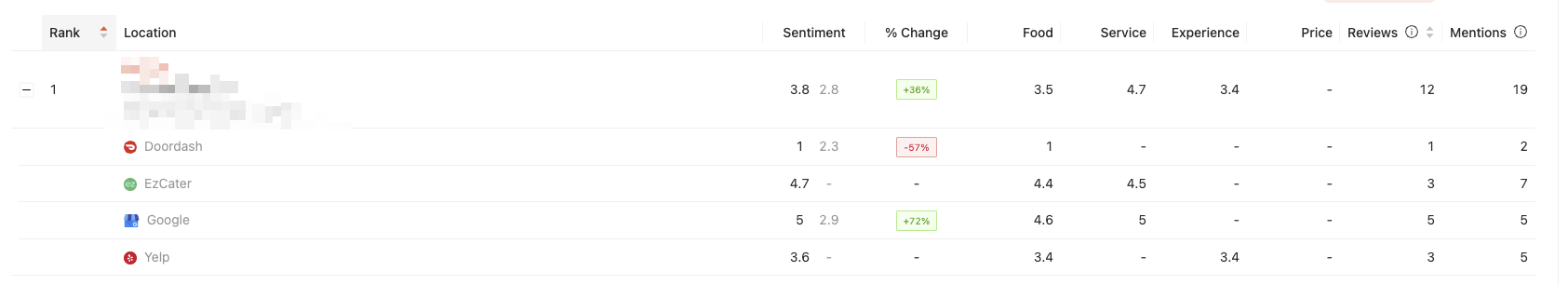 The Location Performance by Category section provides a detailed breakdown of sentiment performance across all locations. Each location is ranked and scored based on overall sentiment, with additional category scores for food, service, experience, and price. This makes it easy to compare performance across multiple locations and identify where specific strengths or challenges exist.