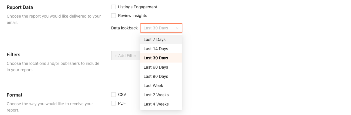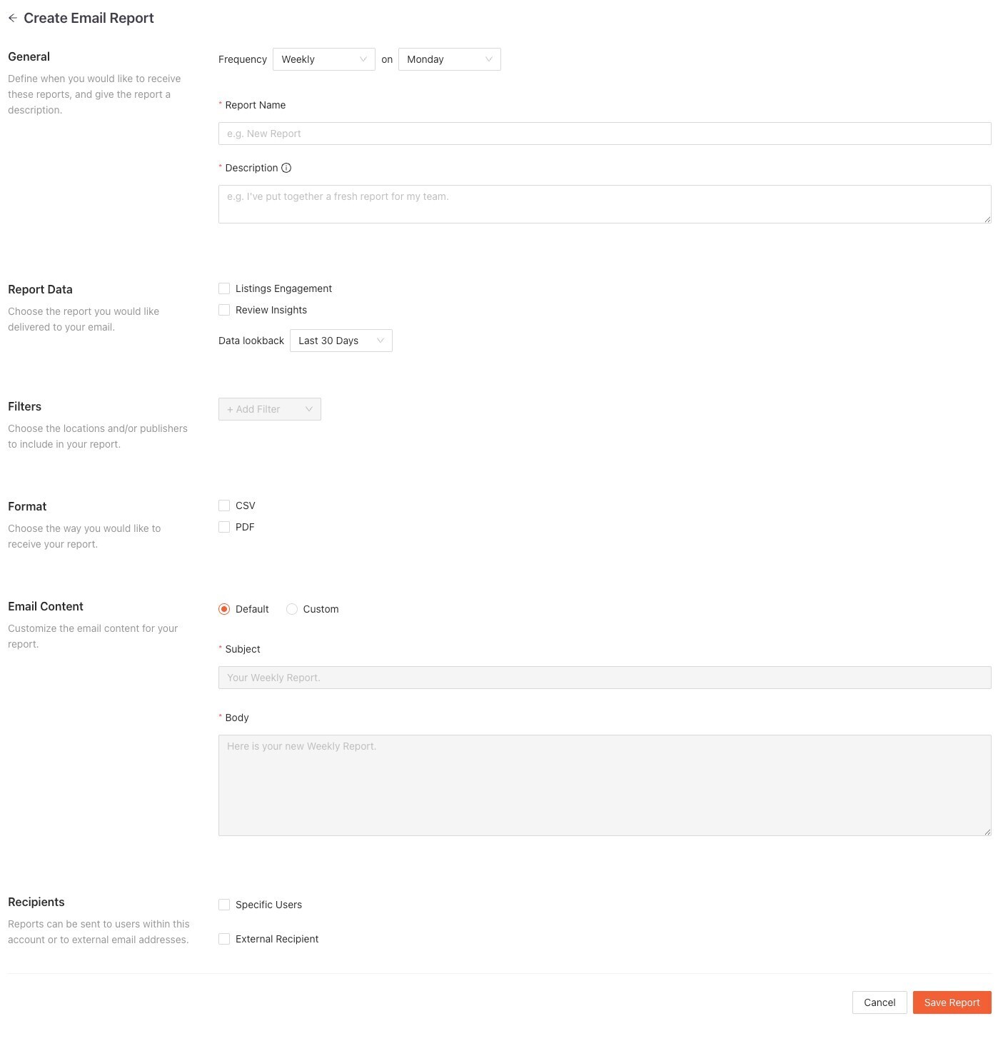 Within the criteria for your email report you are able to set multiple filters. This will allow you to set up reports based on specific locations and publishers, for example: Google and Yelp data for your downtown locations.